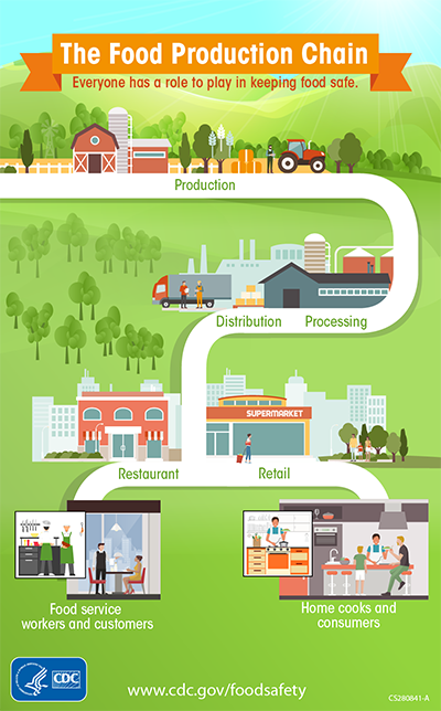 There are many people, places and things involved to deliver food to your kitchen. Here are the basic steps of the food production chain: