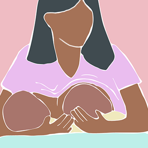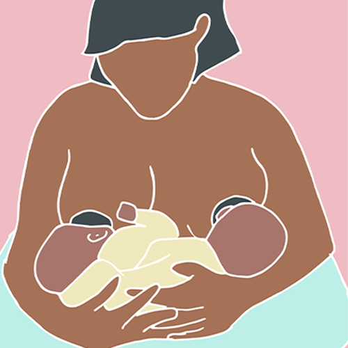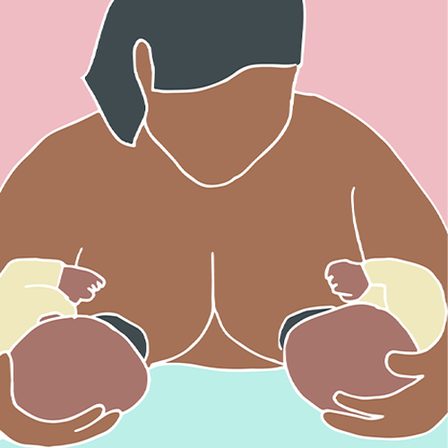 Useful for babies of all sizes. Hold your first baby at your side with their tummy toward you and their head at the level of your nipple. Support your first baby’s head by placing the palm of your hand at the base of their head. Your first baby’s legs should be behind you. After making sure your first baby is comfortably in place with pillows to support them (and you), position your second baby the same way on your other side.